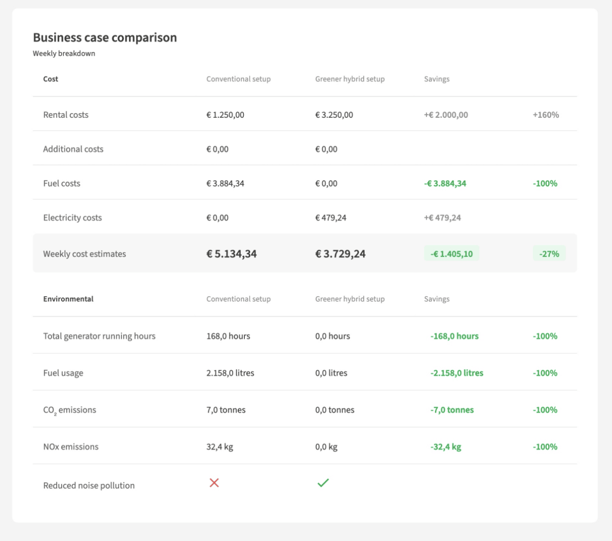 Resultatet är en snygg, co-branded PDF med en fullständig jämförelse av affärscaset: hyreskostnader, bränslekostnader, CO₂-besparingar, generatordriftstimmar och mer, allt sida vid sida.